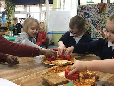 Naughty Bus sent himself and his friends through the post AND two plates of sausages (Halal sausages WERE used when required) and beans arrived at the classroom door.